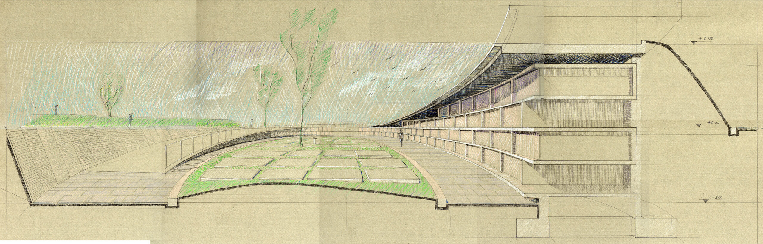 Gli ambiti semi ipogei custodiscono anche gli interri in un suolo morbidamente modellato; e così i percorsi intorno sembrano scavati nel terreno come puliti dalla polvere del tempo. Le cappelle saranno occasione per tutti di devota preghiera, saranno il luogo sacro di tutti i morti… All’interno degli ambiti semi ipogei ci saranno le cappelle private e saranno delle piccole pause alla lunga serie di sepolture verticali. Collocate per lo più in testata delle grandi rampe, sono luoghi sacri di meditazione e preghiera per tutto l’ambito di cui fanno parte. Suggerito dal naturale andamento del progetto, il segno lasciato al tempio crematorio è un segno anch’esso circolare, un ulteriore ambito di meditazione e di preghiera in cui tutti entrando veniamo avvolti.