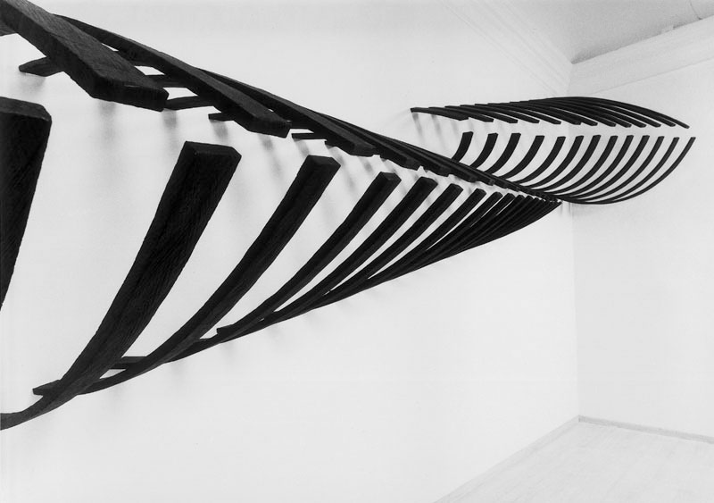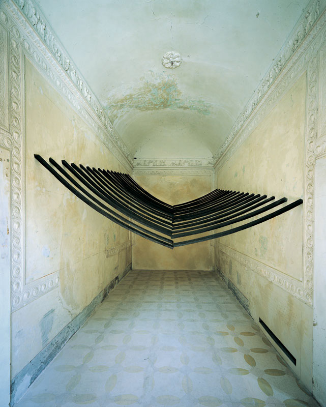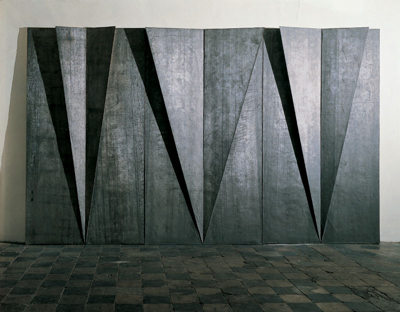 Nunzio. Quella è un opera particolarmente grande che ho realizzato in occasione di una mostra in un museo tedesco nel 1989. Andai a vedere il museo e parlando con il direttore riuscii a convincerlo per farmi assegnare un certo spazio. All’inizio pensavo di fare tutt’altro ma poi è nata questa opera con tanti elementi che sono una specie di alfabeto personale fatto di tanti rimandi, di tanti aspetti come quello della divisione dello spazio oppure della scansione del ritmo. Ma la cosa che mi piace far notare è che questi 51 elementi sono stati appoggiati alle pareti come se fossero in procinto ci essere imbracciati e trasportati via. C’è una forte tensione in questo … come di attesa. Poi, essendo disposti attorno ad un angolo, costituiscono una sorta di percorso di 13 metri e non un’opera da guardare solo nella sua interezza. Il titolo Mediterranea è nato dal fatto che ho impiegato molto tempo per realizzarlo e mi sono accorto di essere andato a pescare nei rapporti più intimi con le mie radici …