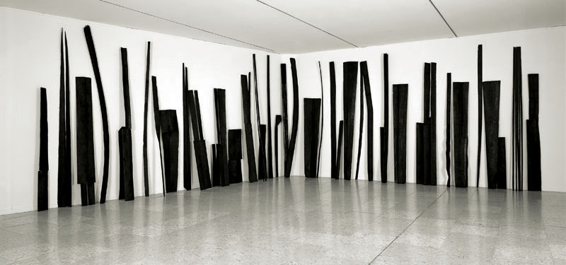 Abbiamo visitato la mostra di Nunzio al Macro proprio un anno fà. Ci ha colpito molto Mediterranea, cinquantuno elementi di legno carbonizzato appoggiati a due pareti d’angolo: discutemmo se fossero lance e scudi archilochei; ci siamo domandati se fossero stati appena deposti oppure erano ordinatamente pronti ad essere imbracciati per l’imminente battaglia; ma poi ci è venuto il dubbio che componessero piuttosto l’alfabeto inespugnabile di una scrittura antica; e prima di andare via abbiamo indugiato ancora po’ sul titolo che sottolineava l’interpretazione di un Mediterraneo come sublime fonte arcaica di matericità, di essenzialità, di ritmicità…