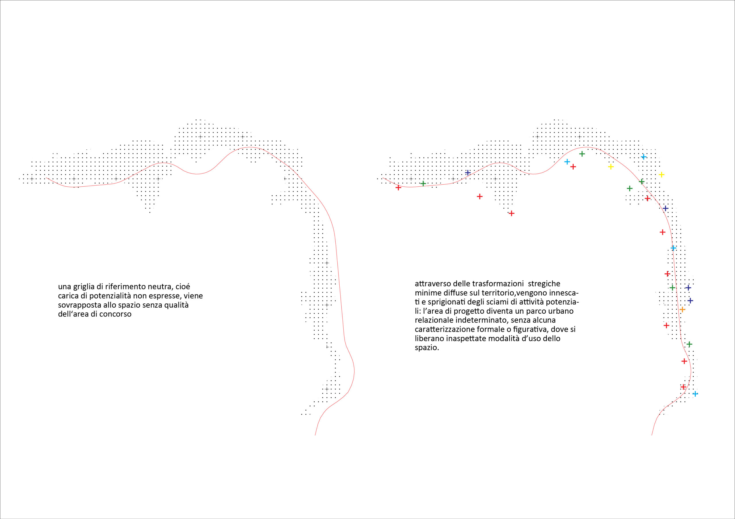 Le ‘note’ sottolineano le qualita’ implicite e problematiche del sito, come l’essere sospeso tra due realta’ autistiche che sembrano voltarsi le spalle (back to back tra costruito e mare), il rimanere un deserto neutro in attesa di essere colonizzato, il costituire un’occasione di riordino del tessuto urbano limitrofo e l’essere attraversato da un asse ferroviario dismesso. Sensibili anche alle più impalpabili caratteristiche di unicità di questo paesaggio, come lo scorrere del tempo, i profumi, i suoni, il vento, ne costruiscono intorno un progetto.