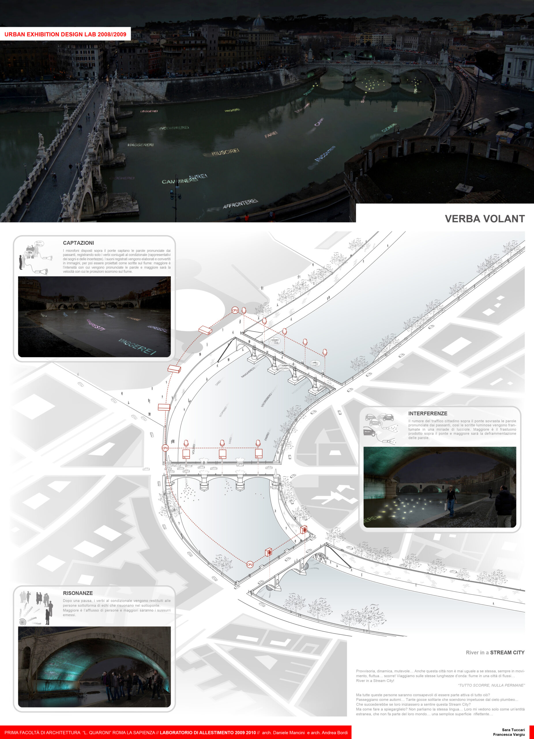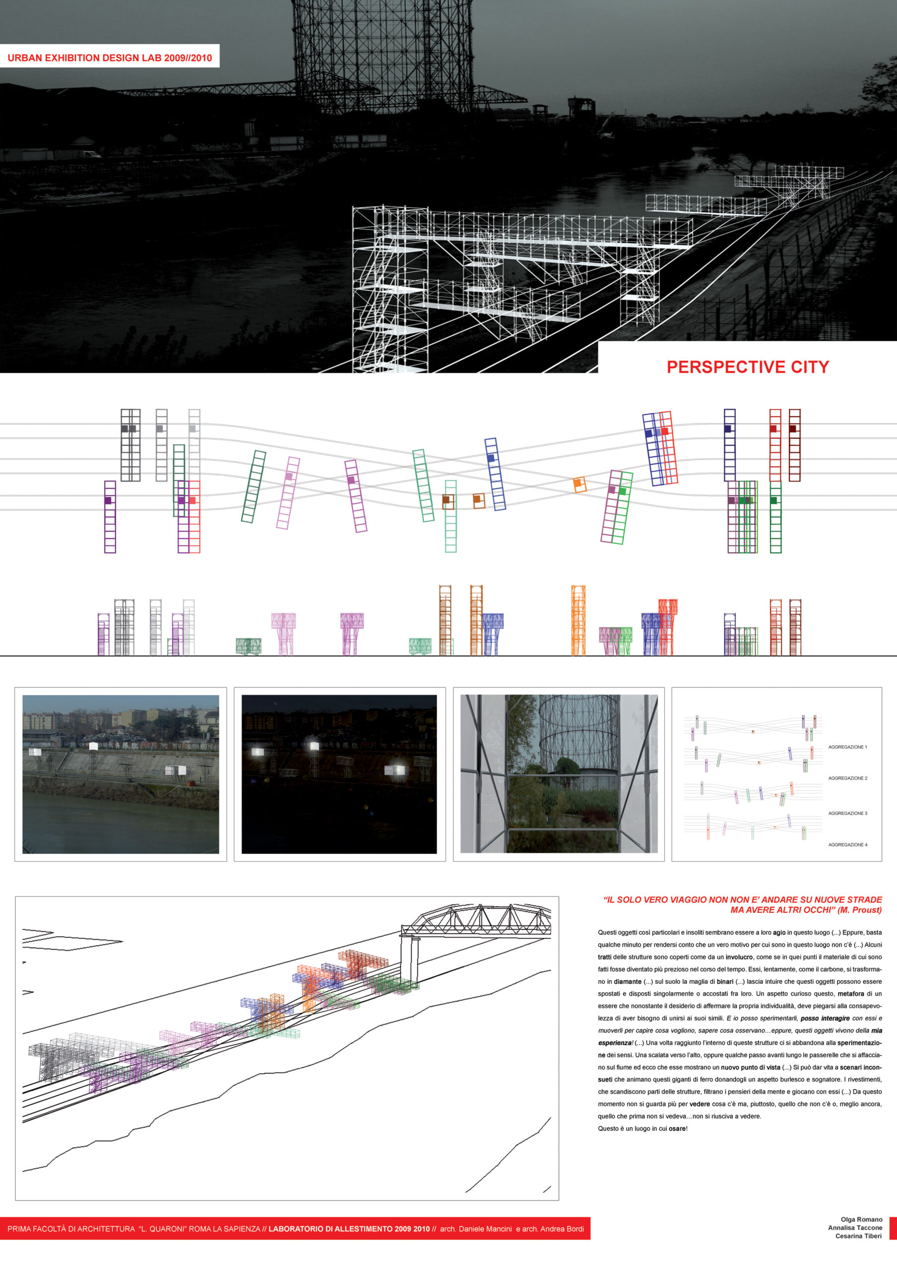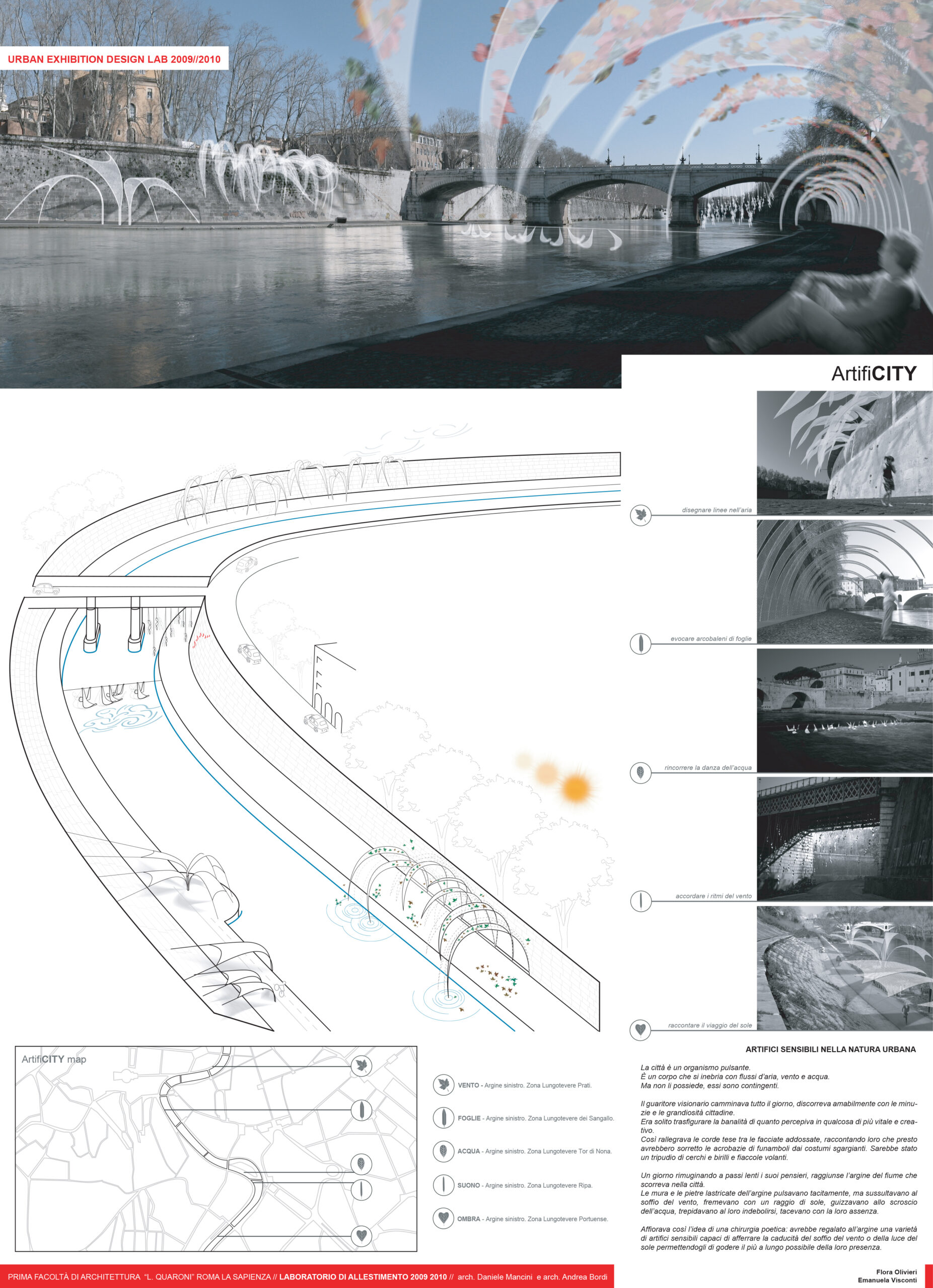 Gli studenti a gruppi progettano un intervento leggero sul Tevere, senza un programma funzionale assegnato: interpretano gli aspetti controversi e ambigui del rapporto del Tevere con la città e propongono una metafora spaziale cioè un allestimento. Questi progetti saranno trasformazioni urbane deboli, effimere, leggere, interattive, relazionali, che però hanno un forte significato e impatto nella percezione della città. Saranno interventi leggeri che oscillano tra l’installazione temporanea e l’evento cioè prototipi di installazioni, microtrasformazioni, palinsesti comunicativi, playgrounds, spazi relazionali, architetture potenziali. Il laboratorio non fornisce un programma funzionale per realizzare un contenitore ma va alla ricerca di un dispositivo spaziale leggero, economico, comunicativo, temporaneo (un allestimento), partecipativo, relazionale che amplifichi con la sua presenza gli aspetti salienti del luogo nel rapporto con la città del luoghi e inneschi dei meccanismi relazionali e partecipativi che facciano comprendere il punto di vista. L’argomento, il tema, l’approccio concettuale è esplorato autonomamente dagli studenti.
